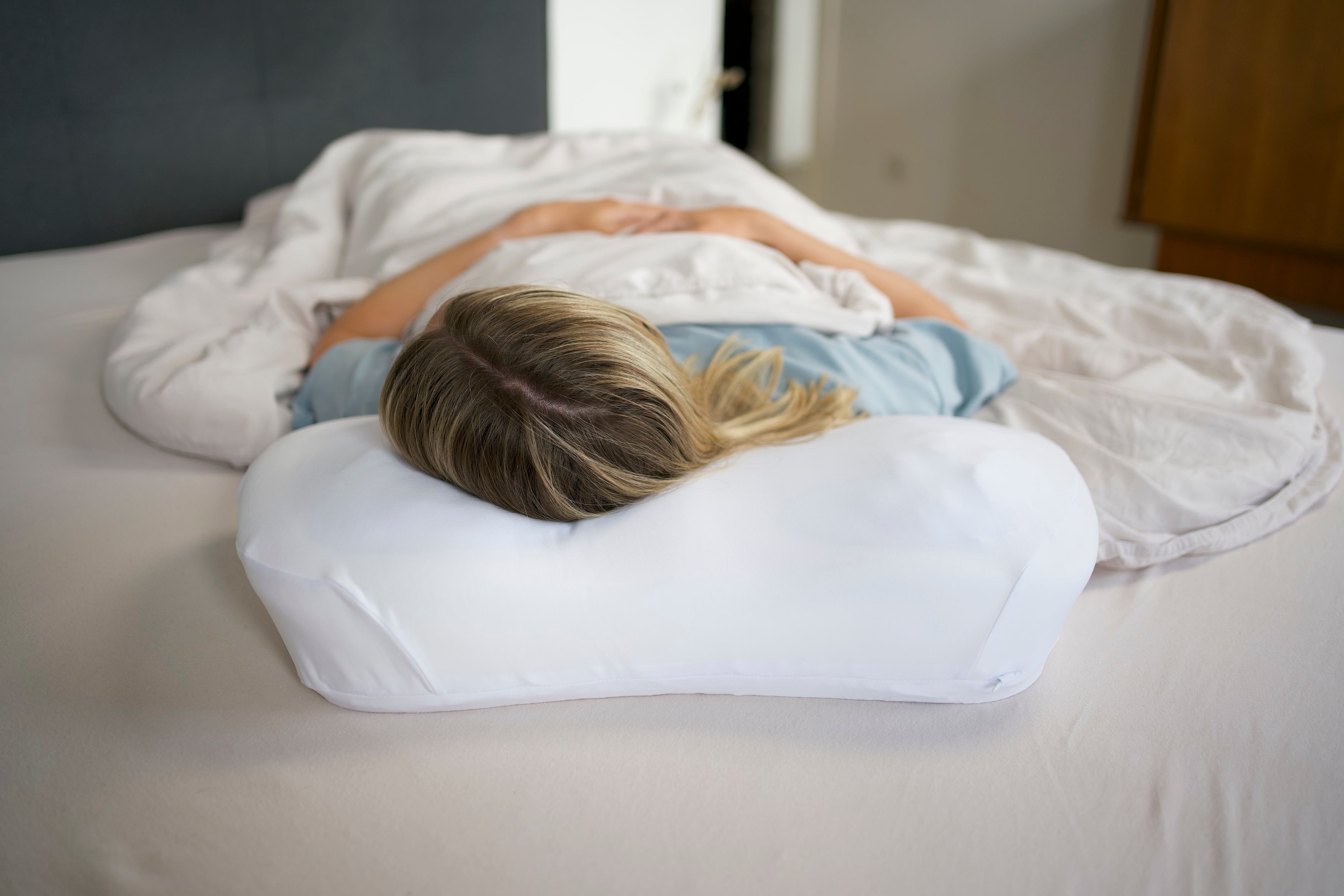 Unser speziell entwickeltes Kissen unterstützt eine leicht seitliche Kopfhaltung, indem es den Kopf sanft nach rechts oder links kippen lässt.